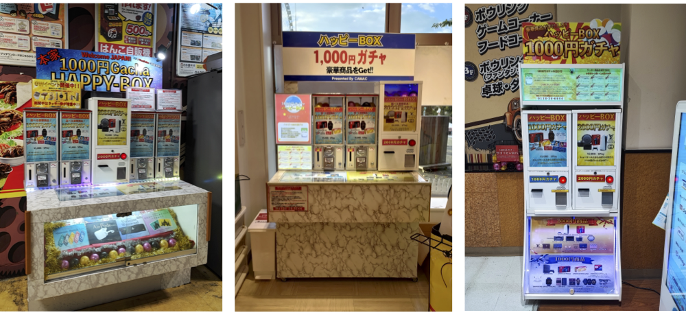テレビやネットの動画配信サイトでも話題の 1000 円ガチャ。 当社 1000 円ガチャ「ハッピーBOX」は、人気テーマパークチケット、ゲーム機、フィギュア、ブランド品、ギフトカード、電化製品などラッキー商品が GET できるもの。従来のガチャガチャ=雑貨入りカプセル自動販売機とは一味も二味も違います。