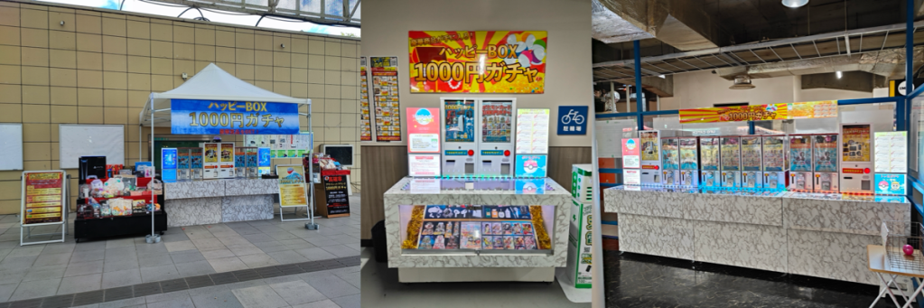当社 1000 円ガチャ「ハッピーBOX」は、一箇所に複数のガチャ機を設置し、異なる台に異なる趣向のラッキー商品を対応させることにより、子供から大人までと幅広い年齢層、また、性別を問わず、多種多様なお客様をターゲットにすることを可能にしました。